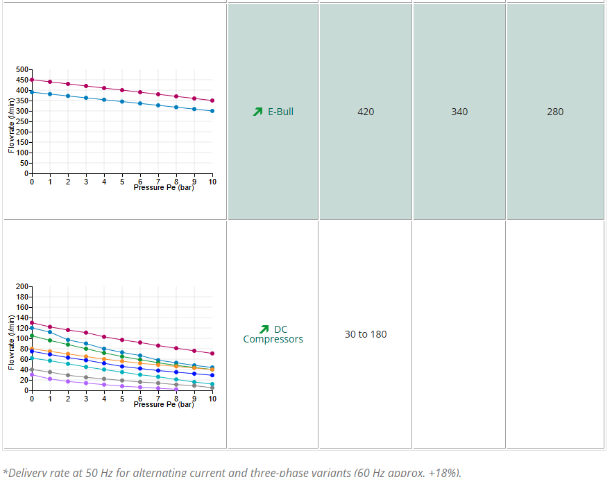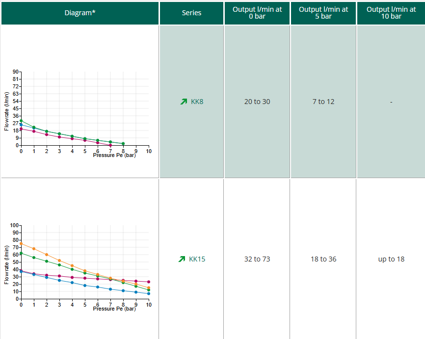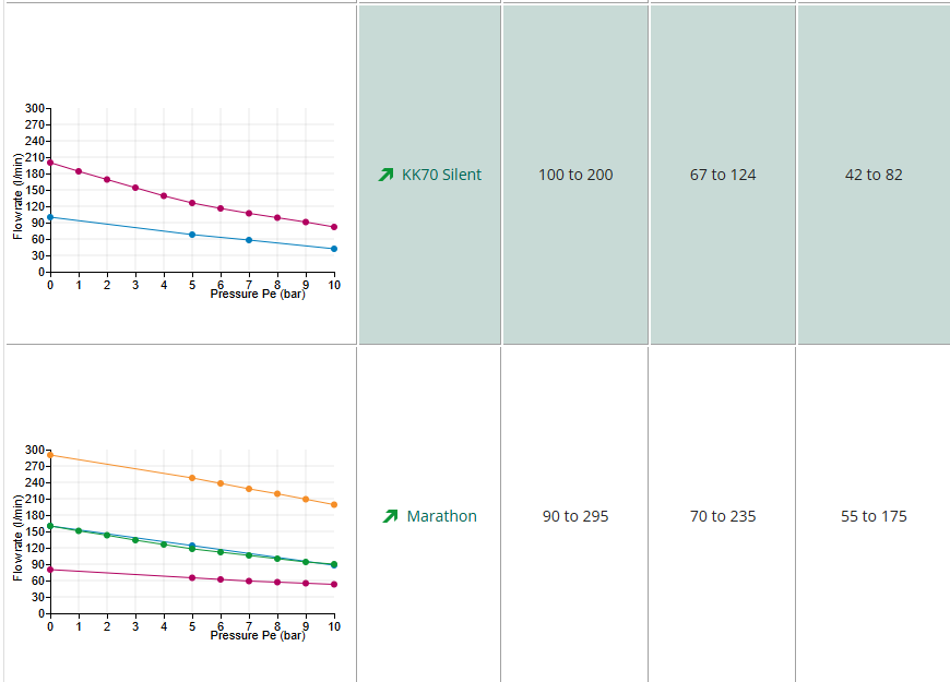 Explore a clear comparison of our oil-free compressor variants, illustrated using characteristic performance curves. The range spans from our smallest KK8-series unit A-020 (20 l/min) to the largest B-304 piston compressor from the Marathon series. Use the curves to assess performance metrics—such as flow rate at varying pressures—and identify the optimal oil-free compressor unit for your application.